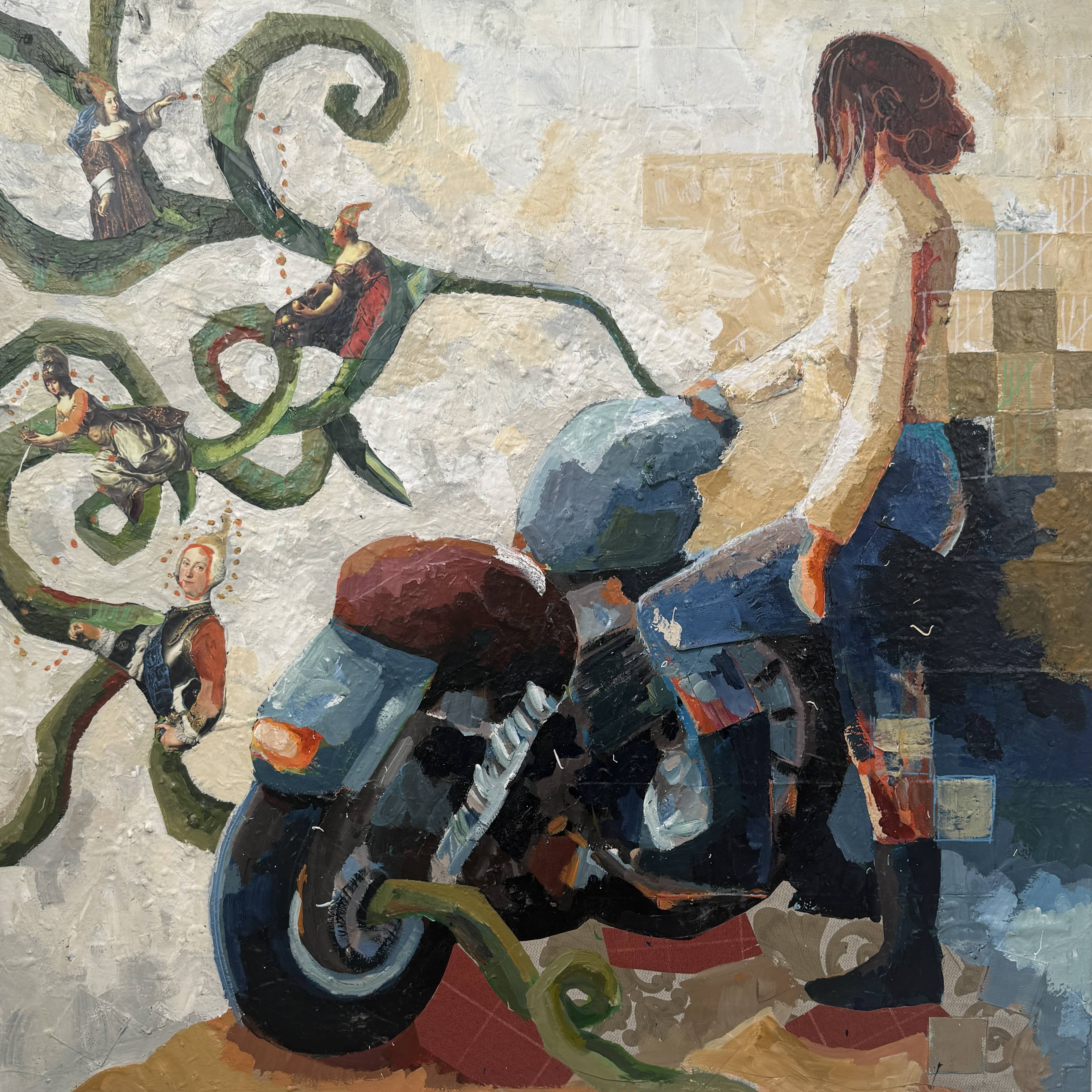 – Jag får massor av inspiration när jag är ute och kör motorcykel – gärna jättesnabbt för då blåser man ut hjärnan. Motorcyklar är mitt stora intresse, därför dyker motorcyklar och bilar upp återkommande i mina målningar. Men det är inte fokus på detaljer utan det är känslan som jag försöker gestalta.