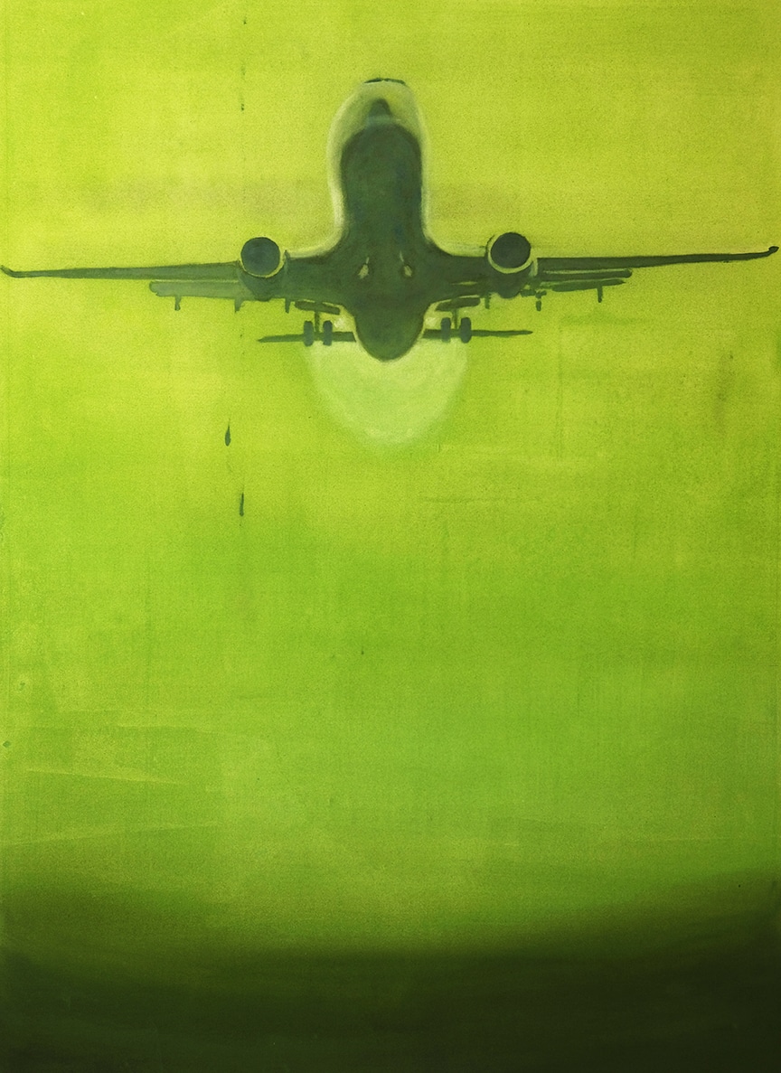 Ett lyftande flygplan i dramatiskt morgonljus fångar en känsla av både frihet och flykt på samma gång genom dess vackra giftgröna färg och enkla komposition.