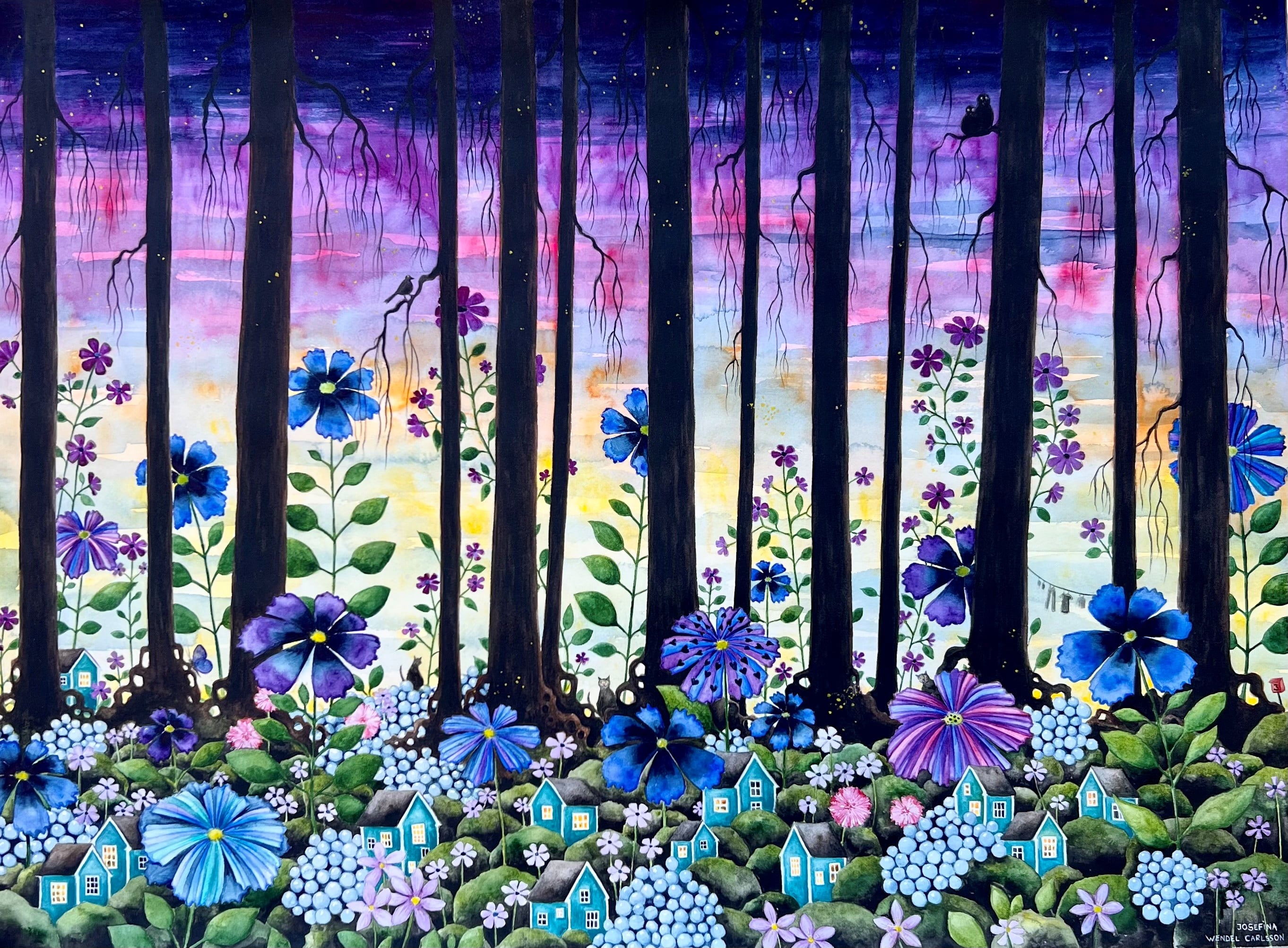 En härligt mustig sagoinspirerad akvarell med lila toner. Tittar man noga ser man att det bor en och annan katt där i skogen…