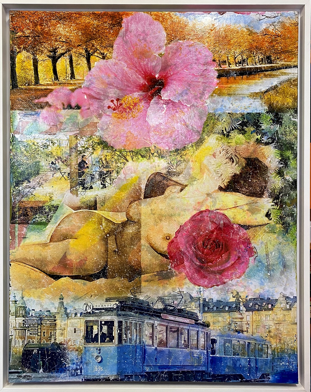 Drömmarnas stad med de fina platserna på Djurgården. Rosendal med sin blommor, Djurgårdsbrunnskanalen i höstskrud och den gamla spårvagnen som tar dig runt. De fina platserna besjälas av människorna som besöker dem. Konstverket är ett riktigt praktverk inramad i vit trälåda, flytande fritt från kant med ca 2 cm.