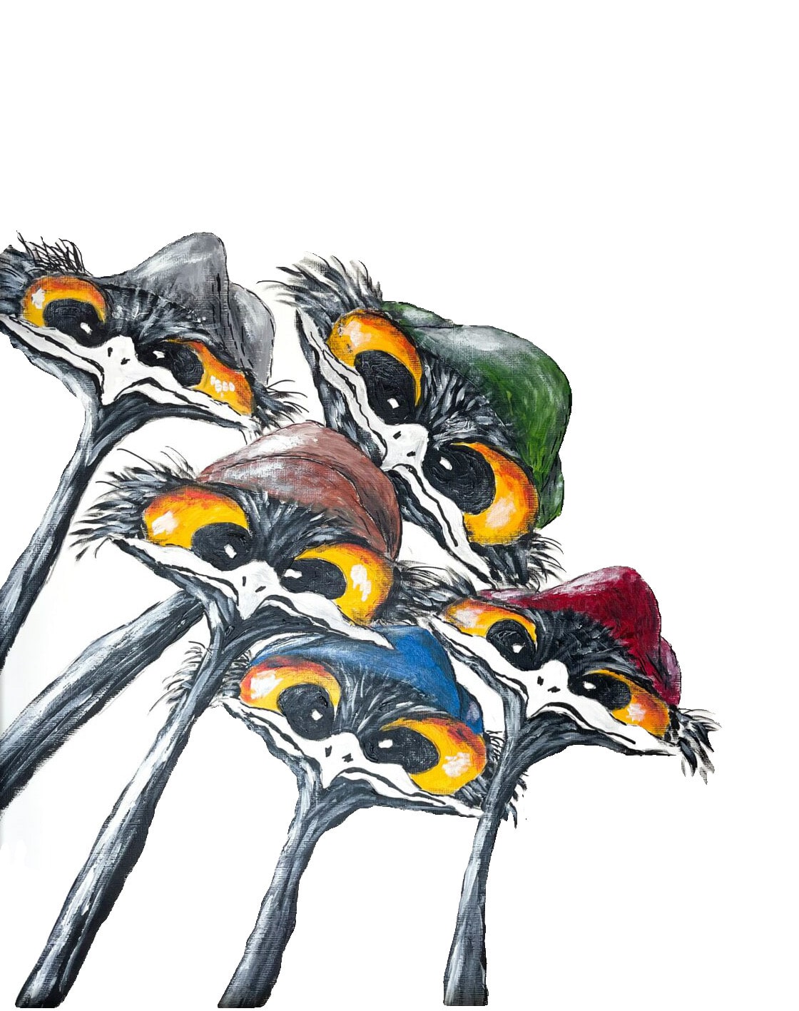 Laurin har målat i runda slängar kring hundratalet solitära strutsar samt ett femtiotal strutsgrupper.