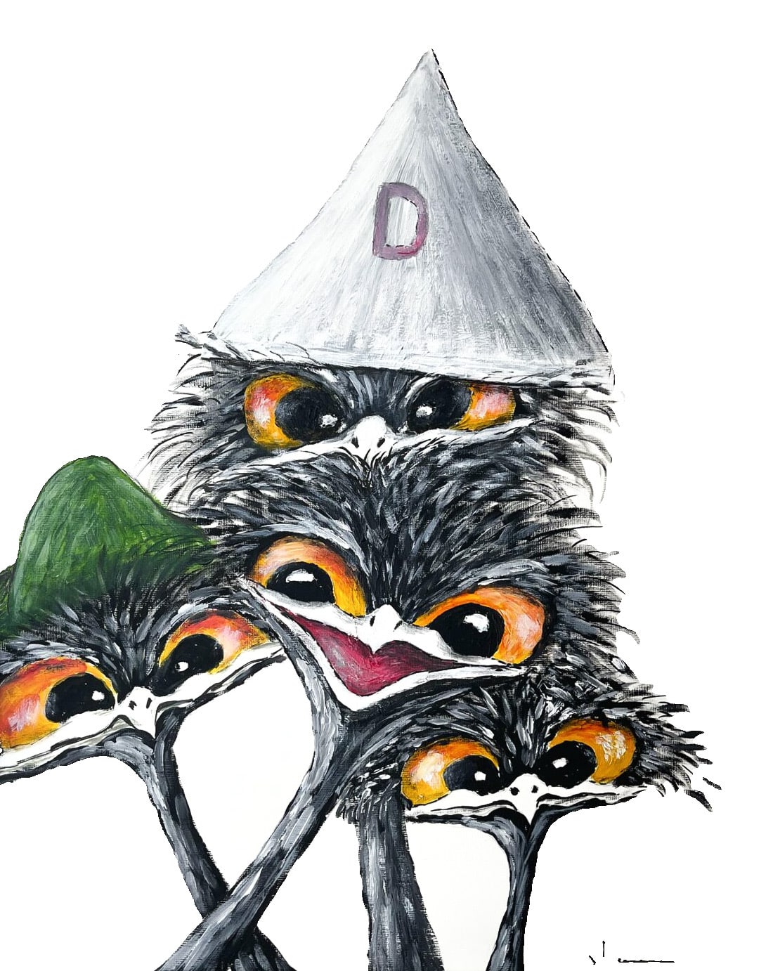 Laurin har målat i runda slängar kring hundratalet solitära strutsar samt ett femtiotal strutsgrupper.